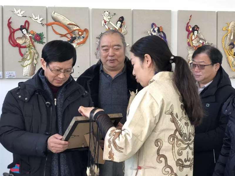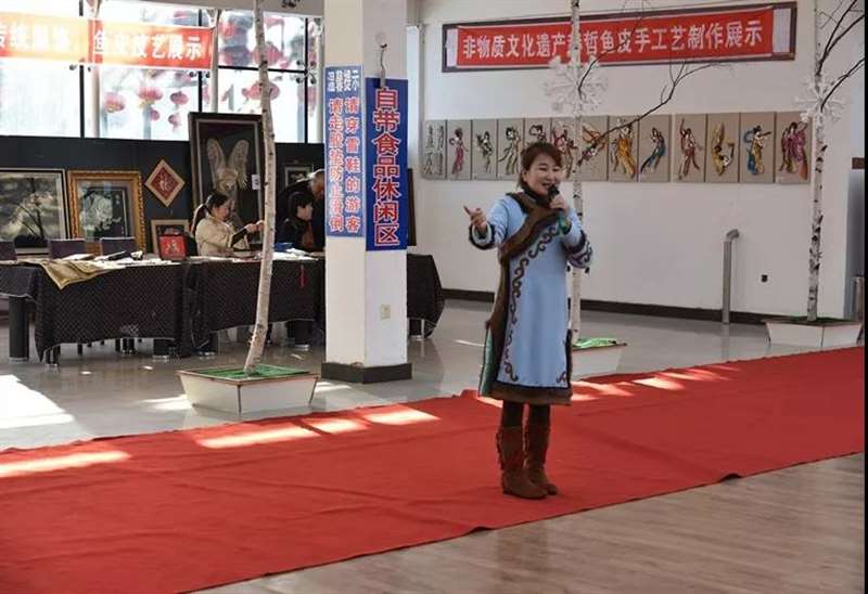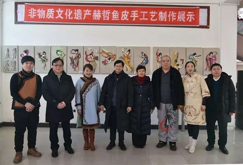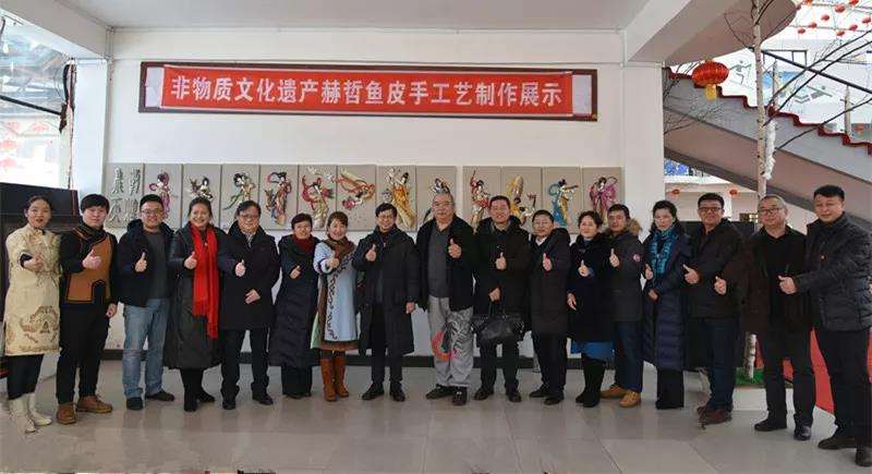 一行观看了原创歌舞表演《卧佛山的雪花飘起来》,随后欣赏了赫哲族伊玛堪传承人表演说唱《伊玛堪》,演出结束后,来到鱼皮画非遗保护展区观看现场展示和现场制作,省、市级代表性传承人尤忠美、解永亮、孙茂密、孙雪细致地讲解和示范鱼皮工艺画制作图纸剪裁、鱼皮剪裁、鱼皮粘贴、技艺法缝制以及成品缝制五大步骤。