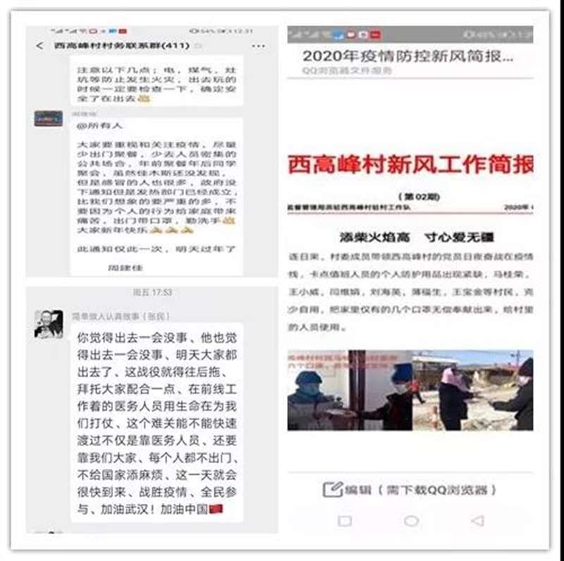 充分发挥“西高峰村村务联系群”、“西高峰党支部群”、“西高峰贫困户联系群”以及驻村工作队编办的“疫情防控新风简报”向村民宣传上级政府对疫情防控政策和各项相关规定,宣传本村在应对疫情防控工作中涌现的好人好事,弘扬正能量。