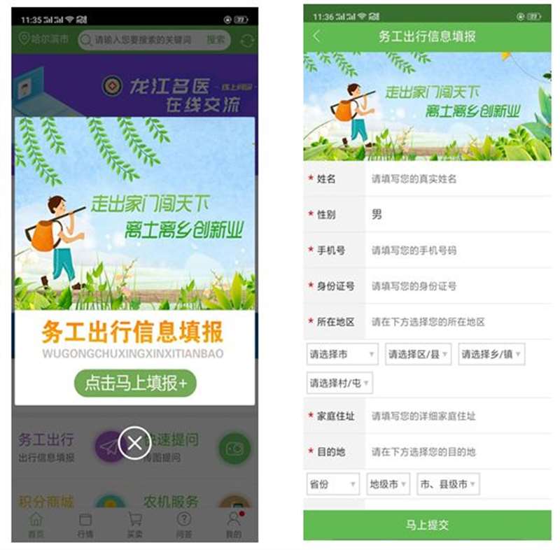 打开惠农助手app,点击首页“务工出行信息填报”,在信息填报界面即可完成出行信息登记。
