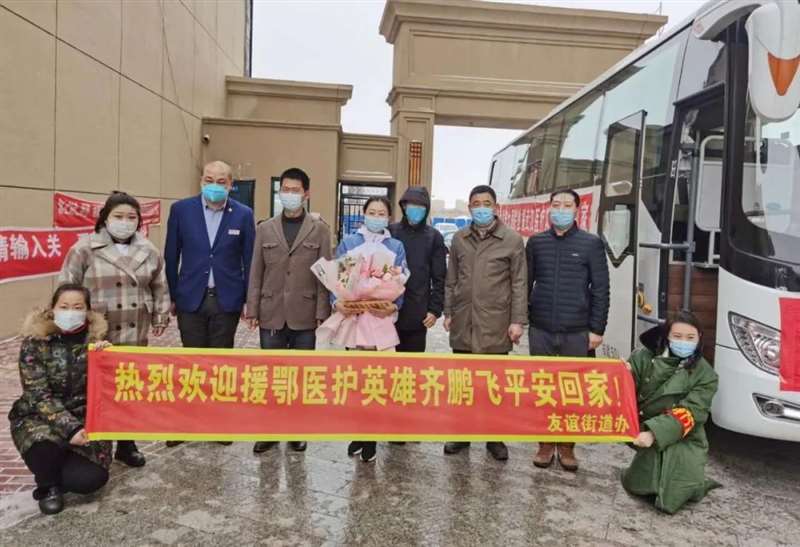 在全国防疫形势极为严峻的时刻,齐鹏飞医生响应党和国家的号召,响应人民的呼唤,白衣执甲,逆行出征、奔赴湖北,在没有硝烟的战场上勇于拼搏,是新时代的英雄。友谊街道办宜福社区为英雄颁发了白衣战士光荣之家的光荣牌,菱建物业为英雄献上了鲜花。