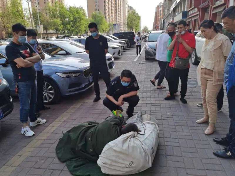 5月30日下午16点30分,冬梅社区网格员李博接到居民微信求助信息,碧水澜庭一门市前躺着一位穿军大衣、口齿不清的老人,由于当时李博正在卡口值班,便第一时间通知了社区主任付莹莹,随后付莹莹与街道综治办主任曲诗聪及组员曹阳一同赶往现场。