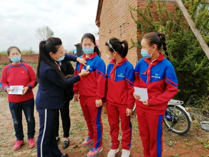 为孩子们佩戴“维权小卫士”勋章,叮嘱她们提高自我防范意识。