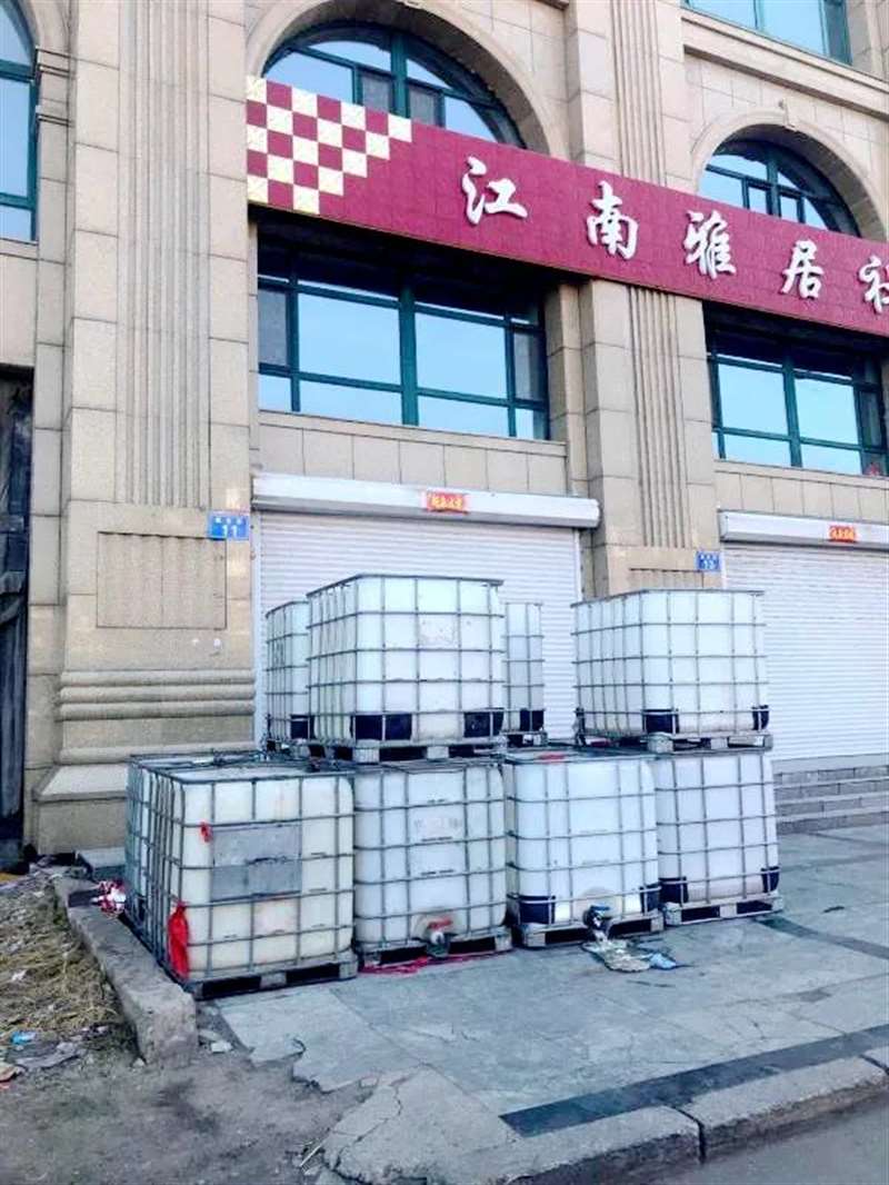 江南雅居北门商铺门口堆放7个吨桶、3辆违停僵尸车,社区下达通知单后,业主已自行清理完毕。