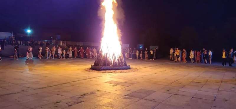 欢腾篝火舞娇娥,劲鼓狂铃萨满歌。篝火晚会在夜幕中精彩启动,现场演员和游客们围绕着篝火载歌载舞,游客们看焰火、玩篝火、唱起歌、跳起舞,整个花海升腾起欢乐的海洋。