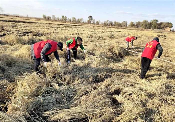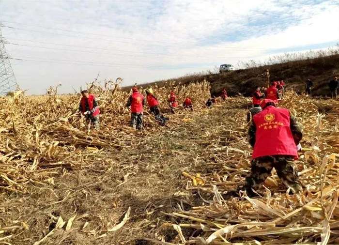 在各个地块内,一个个红色身影不辞辛苦,心无怨言,俯下身子掰棒、割杆,将汗水挥洒在澄澈碧空下的广袤金野里,尽绵薄之力帮助农户。广袤的田野上,志愿者们携手并肩,共同将沉甸甸的果实收获,橙黄似金的玉米与如火炽烈的马甲在阳光下相映生辉,志愿者用最朴实无华的语言,最无私奉献的精神与农户一起谱写收获华章。