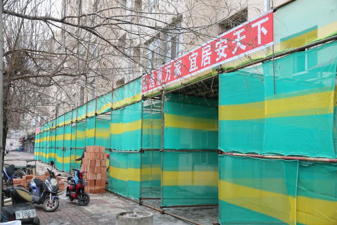 15日,郊区英俊街道办富强社区荣歌小区居民楼外,工人们正在紧张地忙碌着。记者在现场看到,部分小区外墙保护架已经搭好,正在进行拆卸单元门等工作。