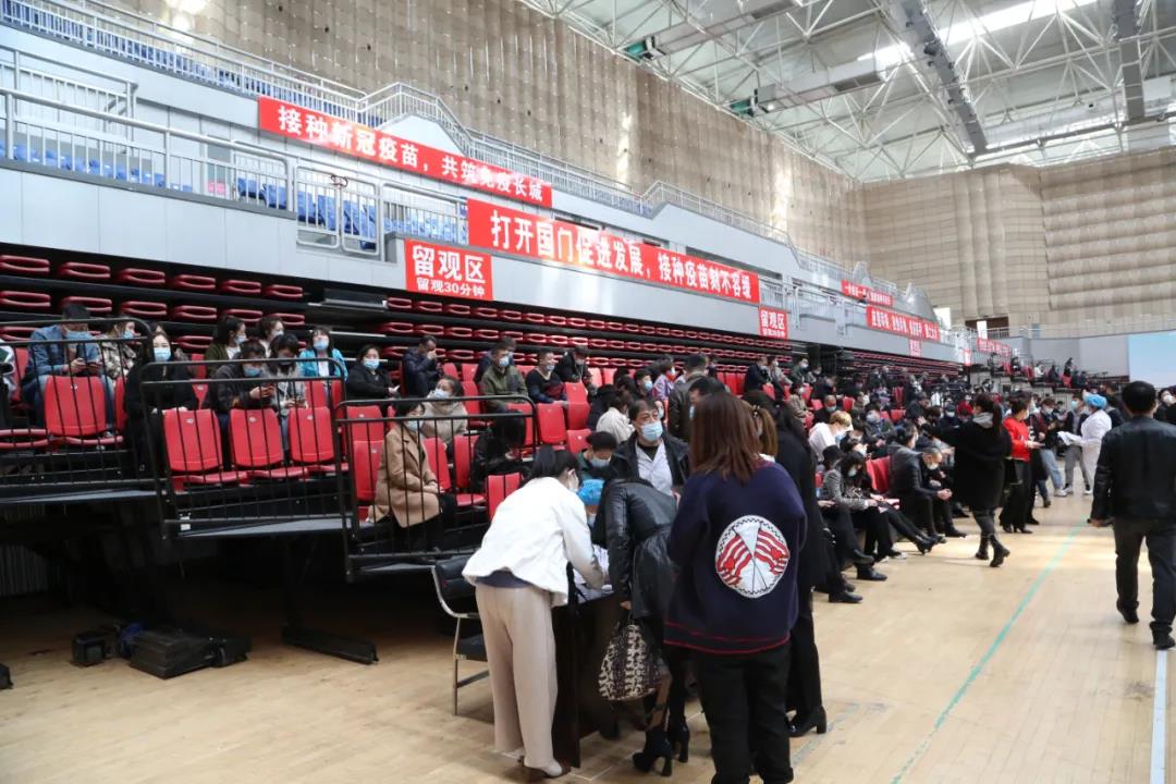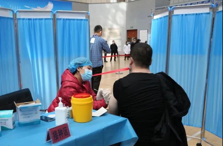 在会展中心临时接种点,设置了20个接种台,指派全区医护人员200余人。在工作人员的指引下,接种人员可快速完成接种。预约的人员在出示身份证等相关证件、信息核对、填写基础信息之后就可以扫码接种疫苗,接种疫苗后需要留观30分钟,无不良反应后便可自行离开。郊区还在进口设置了流动人引导员,同时在接种区内又设定了固定的引导员,保证人员不聚集,保持一米线距离,整个疫苗接种环节闭环式管理,全过程无死角。