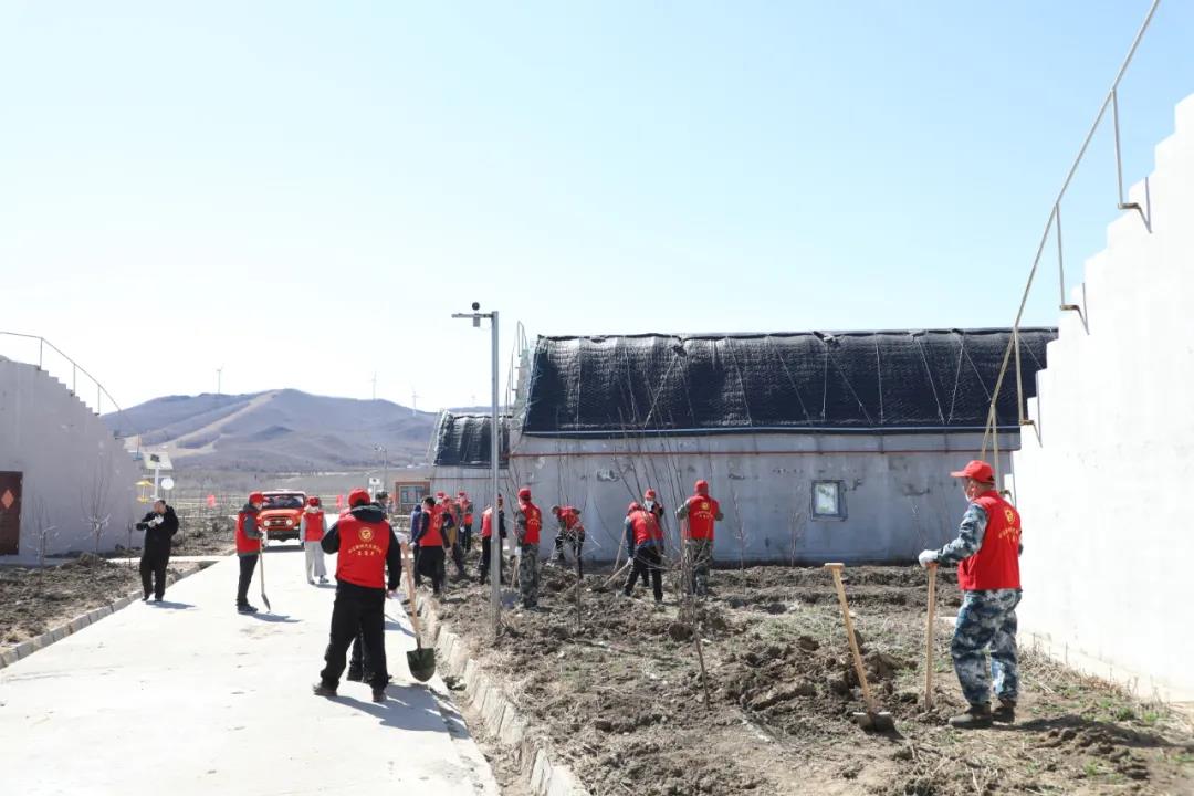 区领导同干部群众一起戴着手套、挥锹铲土、扶苗填土,大家几人一组,相互协作,种下了一株株树苗。虽然强风呼啸,但丝毫没有影响志愿者们植树的热情,道路两侧的旗帜迎风飘扬起来,与热火朝天的劳动场面相互辉映,描绘出一道美丽风景线。经过1个多小时的劳动,440株金叶榆、王族海棠在大田园区“安家落户”。