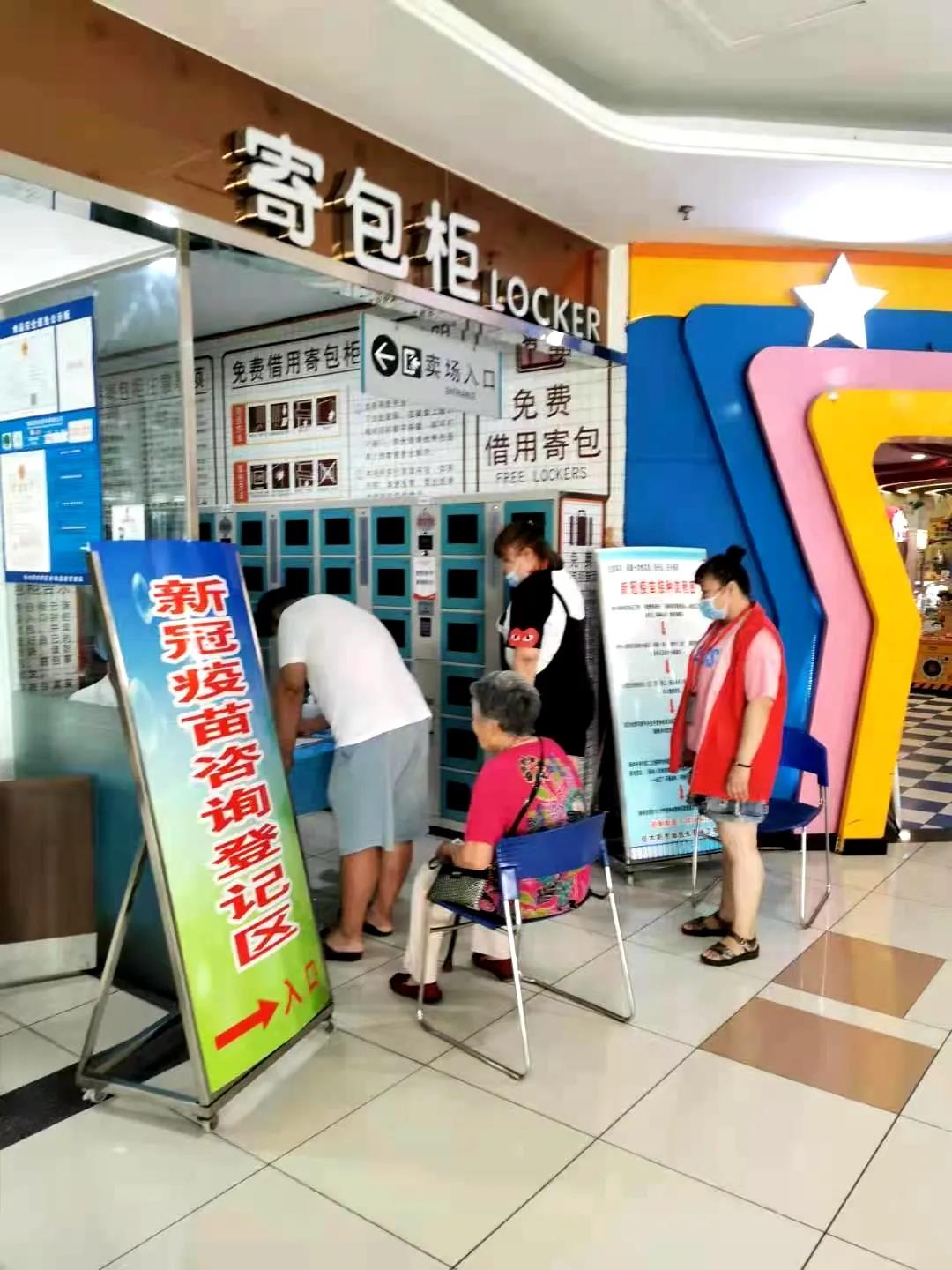在接种现场,规范化的设置了咨询区、登记区、接种区、留观区、异常反应处置区,保障整个接种环节快速、流畅,在超市入口,网格员耐心向居民讲解接种新冠疫苗的必要性和重要性,同时询问是否已接种新冠疫苗,采取自愿的原则,将有意愿接种疫苗的居民引导到疫苗登记区,有序的进行疫苗接种。