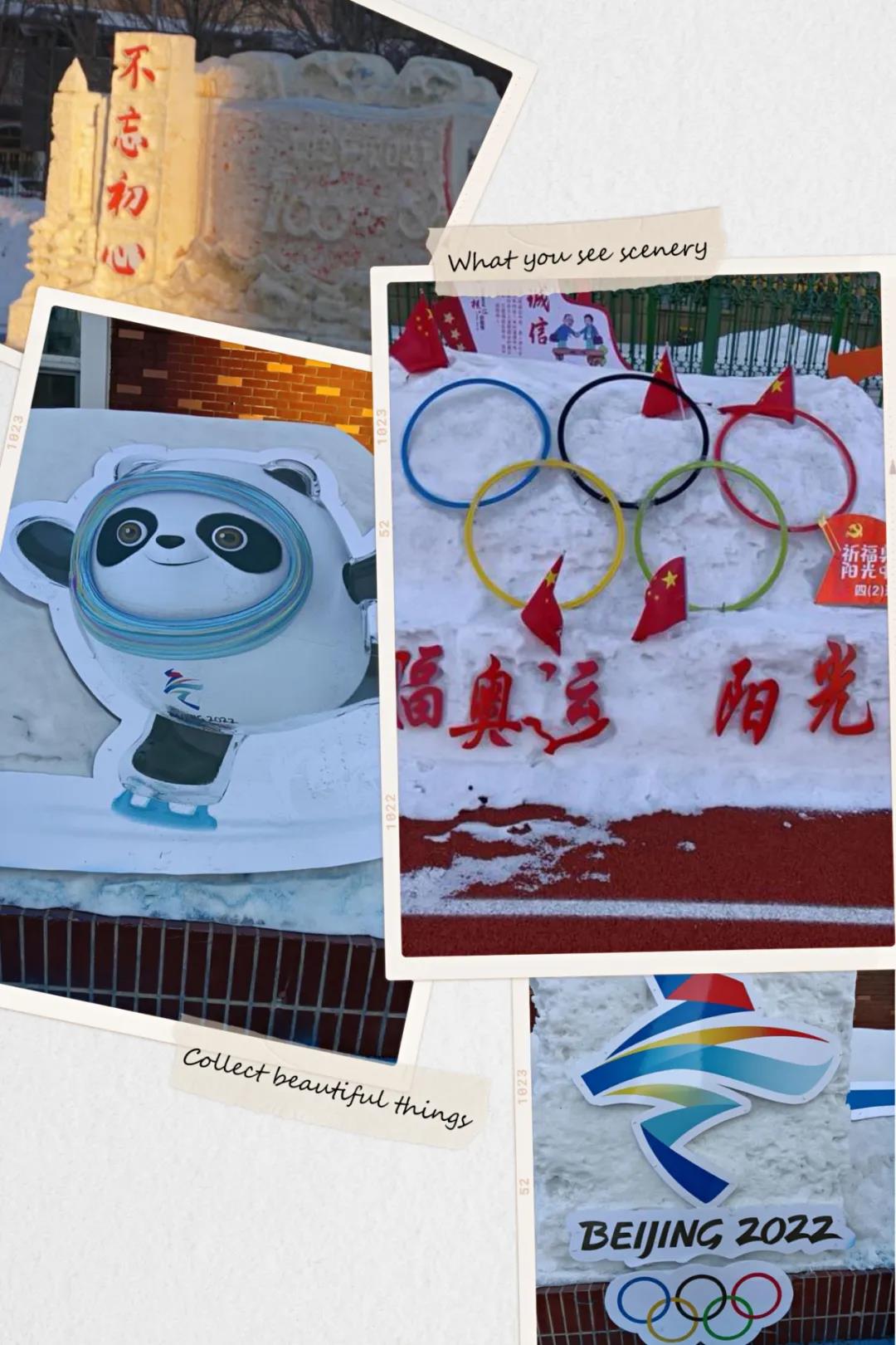 承担比赛场地任务的第十五小学院内,处处呈现着庆祝北京冬奥会的标语、吉祥物、冰雪运动雪雕,为本次比赛营造了深厚的喜庆氛围。