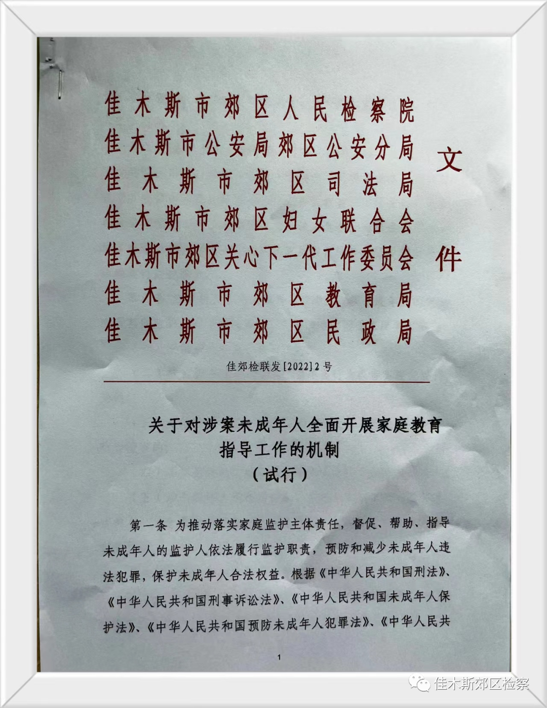5月30日,郊区人民检察院联合区公安分局、区司法局、区妇女联合会、区关心下一代工作委员会、区教育局、区民政局会签印发《关于对涉案未成年人全面开展家庭教育指导工作的机制(试行)》(以下简称《工作机制》),旨在加强多家单位协作,促进未成年人保护制度建立,切实增强未成年人司法保护和社会保护衔接配合,构建未成年人综合保护体系。