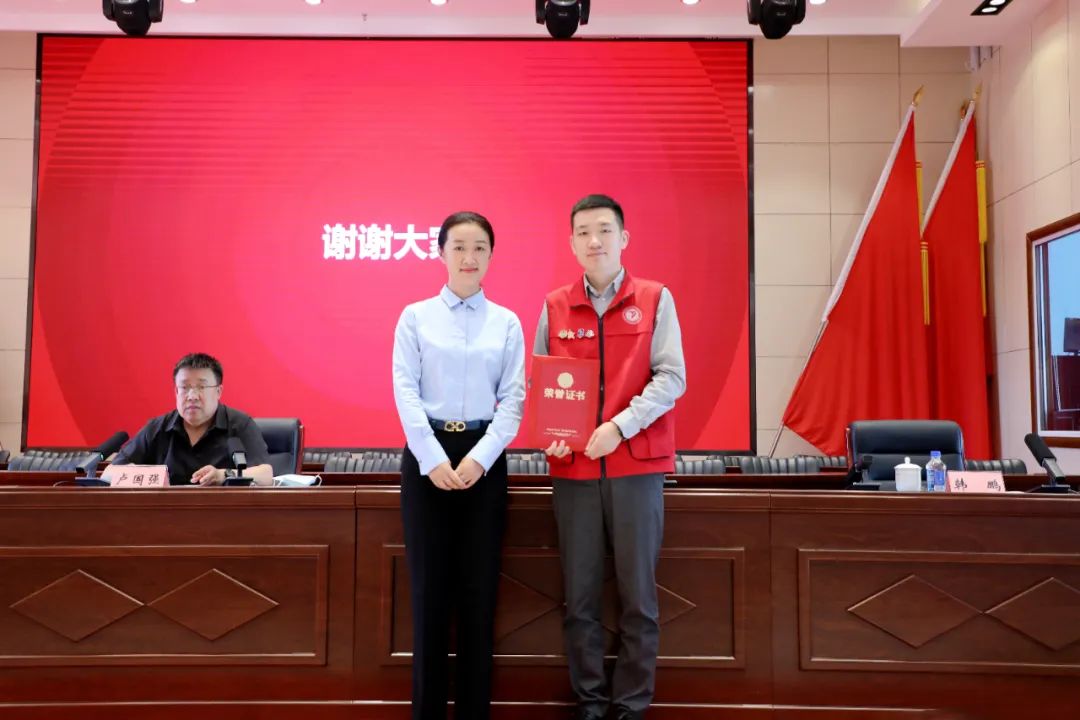 最后,顾玉雪代表区委授予韩鹏为郊区“蒲公英”志愿服务队荣誉队长并颁发相关证书。