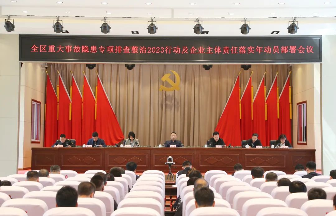 要深入贯彻落实国家、省、市会议精神,深刻吸取近期省内外事故教训,全面开展全区重大事故隐患专项排查整治2023行动,坚决防范遏制各类事故发生,推进“企业主体责任落实年”工作走深走实,各相关单位要严格对照行动方案,强化“三个层面”责任落实,抓好“四个方面”重点工作,确保全区安全形势平稳有序。