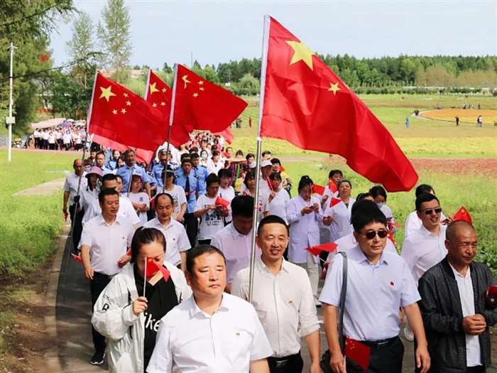 祖国华诞七十载,华夏神州披锦绣。为庆祝新中国成立70周年,引导全区干部职工和社会各界群众共抒爱国情怀,8月25日上午,郊区在达勒花海举办了“放歌花之海 颂歌新时代”为主题的千名干部群众向祖国献礼活动。活动由区委、区政府主办,区委宣传部、区文体广电和旅游局承办。区四个班子领导、机关干部、教师、护士、学生、工人、农民、赫哲族艺术家、游客等各届代表2000余人参加了此次活动。 拍摄活动于上午八时准时开始,1000余人在达勒花海广场伴随着歌曲《我和我的祖国》优美的旋律、展开嘹亮的歌喉,八位护旗手守护着五星红旗,五十面鲜红的国旗迎风飘扬,浓厚的爱国之情洒向整个广场。 二十名人民教师高高擎起200多平方米的巨幅国旗,奔跑于花海之路,对祖国崇敬的暖流迅速涌上每个人的心头。 当一面印有“祖国在我心中”巨大的红旗从花海两山阁顶向下抛落并徐徐在人群中展开时,全体参与者高呼“我爱你中国”“祖国万岁”,将整个活动推向了高潮,对伟大祖国成立70周年最热忱的献礼与最美好的祝愿响彻在人们的心头。 青山绿水间的达勒花海上空,回荡着豪迈的赞歌,干部群众齐声歌唱祖国。歌声唱出了郊区奋进新时代的坚定步伐,唱出了郊区干部群众奋进新时代的崭新风貌。 拍摄中不断有游人参与到合唱中来,农民、工人、学生、志愿者、党员干部代表,围观的人群也在现场气氛的感染下挥动双臂一起高歌 “歌唱我们亲爱的祖国……”一首歌道不尽对郊区的无限热爱,道不尽对祖国的无比崇敬! 赏花、游园、颂歌,歌声伴着花香构成了一幅绚丽多彩的画卷。 青山绿水晓风吟,华夏欢歌永向前。这是一场活力四射的青春快闪,亦是一份献给祖国的深情厚礼。壮丽70年,阔步新时代,在区委、区政府的坚强领导下,郊区各行各业正阔步前行,奋进新时代、展示新面貌,凝神聚力、开拓进取,努力为建设“工业强区、旅游名区、智慧新区、开放兴区”贡献智慧和力量!
