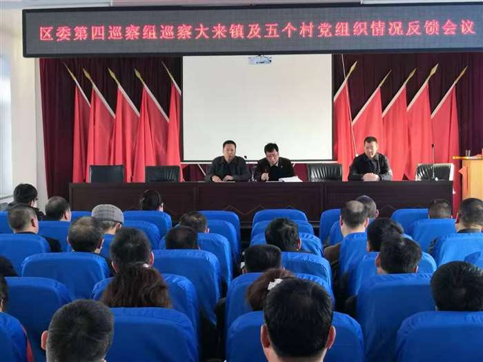 会上,区委第四巡察组反馈了大来镇党委及五个行政村党组织在思想建设、政治建设、组织建设、作风建设和纪律建设等方面存在的问题并提出整改建议。大来镇党委表态发言,一是提高政治站位,落实全面从严治党。镇、村两级干部一定要认真贯彻落实区委巡察工作部署,以高度的政治自觉、强烈的责任担当,切实把思想和行动统一到巡察反馈意见上来;二是突出重点问题,抓好整改落实。要根据区委巡察反馈的意见和提出的要求成立整改工作组,制定整改方案,迅速行动,立行立改,坚决整改到位;三是转化巡察成果,统筹推进各项工作。以此次巡察整改工作为契机,做好点面结合,全面转化巡察整改各项成果,促使全镇各项工作更好更快发展。