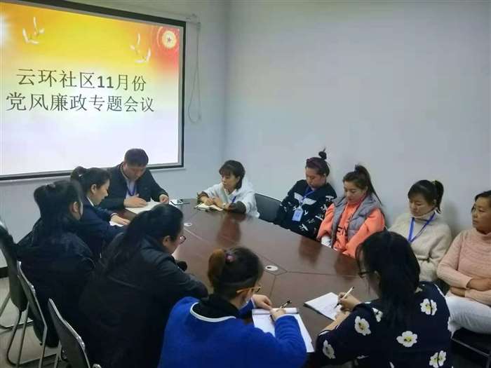 为进一步强化基层党风廉政建设,增强党员干部廉洁意识,不断增强政治责任感和历史使命感, 11月30日下午,云环社区在会议室组织召开党风廉政专题会议,全体工作人员参会。 会议传达学习了上级部门关于五起违反中央八项规定精神典型案例的通报,并对其案例作了讲解、分析,要求全体工作人员严守政治纪律和政治规矩,吸取典型警示案件教训,引以为戒,警钟长鸣;学习了新修订的《中国共产党纪律处分条例》,对各支部、全体党员下一步学习作出工作部署。 会议要求,要严格落实党风廉政主体责任,认真履行“一岗双责”,始终把党风廉政建设贯穿各项工作;要抓早抓小、防微杜渐,防止苗头性、倾向性问题发生,对违规行为“零容忍”;社区干部要严于律己,带好队伍,带头遵守政治纪律,坚持按原则、按程序办事,做廉洁自律示范的标杆;主动服务,认真办理居民群众反映的各类问题,尽职尽责做好服务居民群众的各项工作,营造社区上下风清气正的良好氛围。