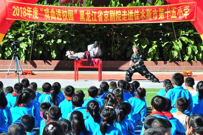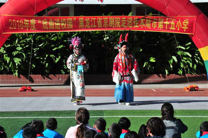 近日,第十五小学校园里紧锣密鼓,热闹非凡。为落实国务院京剧进课堂的要求,2018年度“戏曲进校园”黑龙江省京剧院走进郊区第十五小学进行公益演出。全区各学校音乐教师和第十五小学全体师生观看了此次演出。 此次公演的节目有京胡独奏,传统京剧《三岔口》、《拾玉镯》、《红灯记》、《四郎探母》、《铡美案》等片段。演员们的服饰、扮相、舞台功夫令在场的学生们耳目一新,激发了他们的观看热情。为了让学生们对国粹京剧有比较深入的了解,主持人现场对京剧的起源、特点、行当、写意性表演技巧等进行了深入浅出的讲解并配合相应的表演,这使学生对京剧产生了浓厚的兴趣。学生上台与演员互动,表演刀花,水袖,亲身体验京剧表演的独特魅力。 演员们精彩的台上表演,字正腔圆的唱功,青衣花旦的形体造型艺术更是赢得了师生们一浪高过一浪的掌声! 京剧作为国粹之一,带有浓重的文化色彩,因离学生们的生活久远而被淡薄忽略。本次“戏曲进校园”活动使全区音乐教师和第十五小学的师生们零距离现场感受国粹京剧的魅力,在传承和普及中华民族传统文化,诠释其精髓和真谛的同时弘扬了正能量,让我们为伟大的民族而自豪!