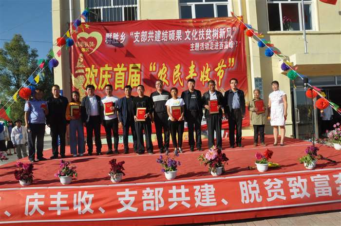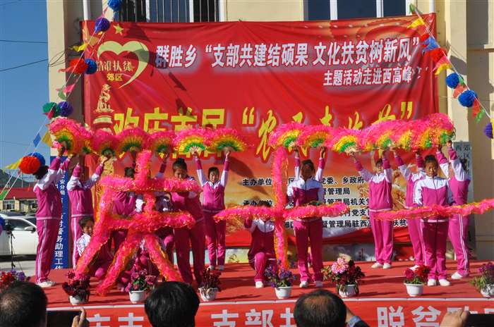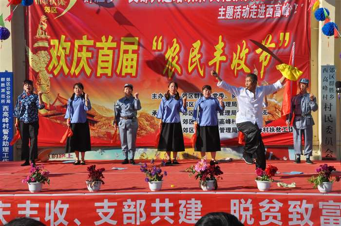 “支部共建结硕果、文化扶贫树新风”, 9月20日,群胜乡庆祝首届农民丰收节主题活动走进西高峰村。此次活动由群胜乡党委、乡政府,区市场监督管理局主办。郊区委组织部、宣传部、扶贫办、区市场监督管理局等单位负责人、群胜乡党政班子成员、郊区市场监督管理局的全体帮扶干部以及各村三职干部共同参加了活动。 “庆丰收”主题活动节目样式新颖,内容丰富,开场舞《丰收的日子》舞姿优美;原创音乐快板《扶贫颂》展现了脱贫攻坚工作取得的累累硕果;扇子舞《祝福祖国》表达了农民百姓喜获丰收迎国庆、祝福祖国的美好心声;各村文艺人演唱的《一个都不能少》、《北国之春》、《妈妈我想你》博得台下观众的阵阵掌声;小朋友们的街舞表演成为整场演出的一道亮丽风景线;而活动中的“乡风文明颁奖”环节更是充分展现了在乡村振兴道路上涌现的一个个典型,脱贫励志户、孝亲敬老模范、卫生文明标兵户、卫生文明示范户,每一位典型人物都是全村人民学习的好榜样。活动在声音嘹亮、气势恢宏的红歌大联唱《歌唱祖国》、《今天是你的生日》中圆满结束。参演此次庆丰收主题活动的表演者既有年过70的村里文化人;又有10几岁朝气蓬勃的祖国花朵;也有驻村工作队的帮扶干部、村两委成员。不同年龄、不同身份,但大家却有同样的心愿:庆丰收、迎国庆,助力乡村振兴发展,共同打赢脱贫攻坚战,为决胜全面建成小康社会,实现伟大中国梦而努力奋斗。