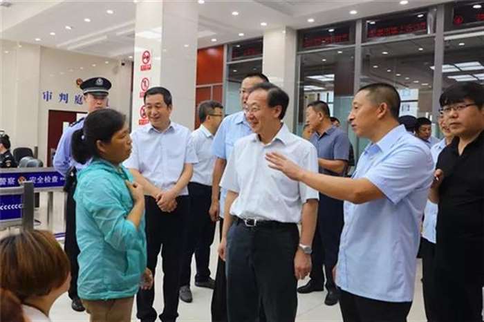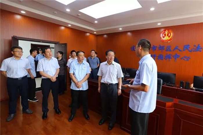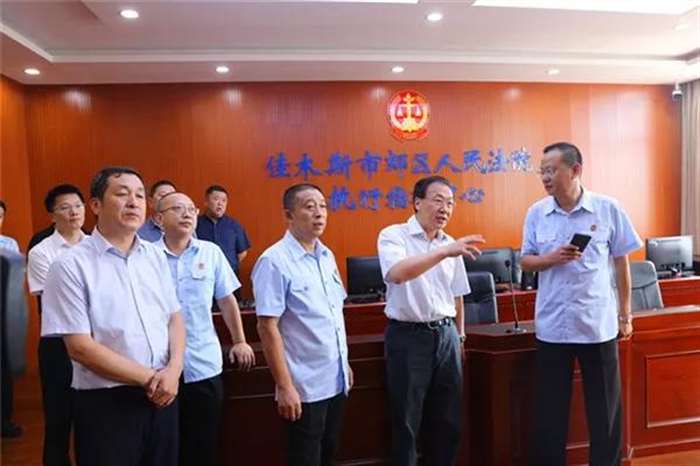 8月6日上午,佳木斯市委书记徐建国率领市委办、市委政研室、市委政法委、市公安局等领导一行深入佳木斯市郊区人民法院进行调研,市中院党组书记、院长韩辉、郊区区委书记高志军、区委常委、政法委书记曲松涛、郊区法院党组书记、院长王斌参加调研。 徐建国一行实地考察了郊区人民法院诉讼服务中心、审判法庭、执行指挥中心等场所,详细询问了相关工作情况。并来到郊区法院佳西人民法庭看望慰问了法庭干警,随后与市中级法院班子成员及城区四个基层法院院长进行座谈。 诉讼服务中心 在诉讼服务中心,王斌向徐建国汇报了郊区法院诉讼服务中心的软硬件的建设情况,通过在诉讼服务中心设立立案、缴费、法律文书送达、诉前调解、法律咨询、判后答疑等多个窗口, 为群众提供“一站式、全方位、低成本”的诉讼服务。设置信访接待室,实行院长每日接访制度,班子成员每个工作日在诉讼服务中心信访室轮流挂牌接访,及时有效地处理群众所反映的问题。徐建国对该院延伸窗口服务功能,深化便民利民措施,改善老百姓的诉讼环境,不断满足群众司法需求表示肯定。