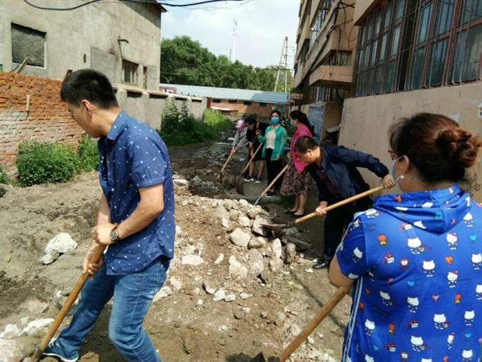 7月19日上午,起点社区社区党工委书记组织所有工作人员拿着铁锹、扫把等工具,不怕脏、不嫌累,义务为居民把路垫平。此举得到了居民一致好评。