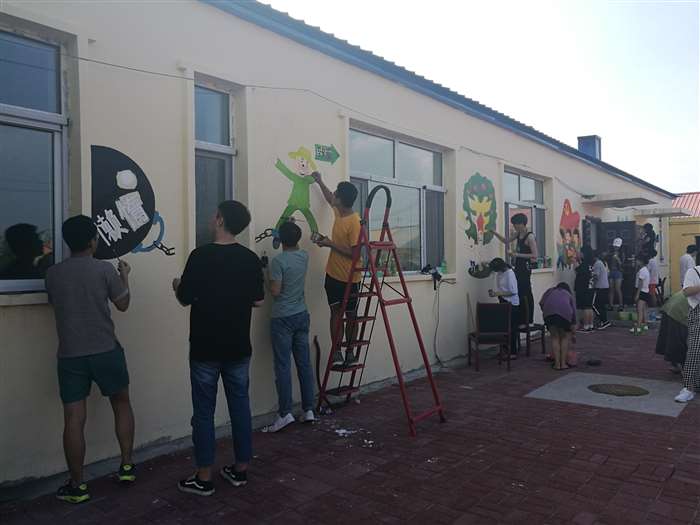 活动当天,学生们顶着烈日,以村民们喜闻乐见的漫画方式进行墙面彩绘,内容结合福胜村精准扶贫、移风易俗。在学生们的认真绘制下,色彩丰富的彩绘遍及整个村委会墙面,一幅幅墙绘作品呈现在大家面前,成为村庄里一条亮丽的风景线。