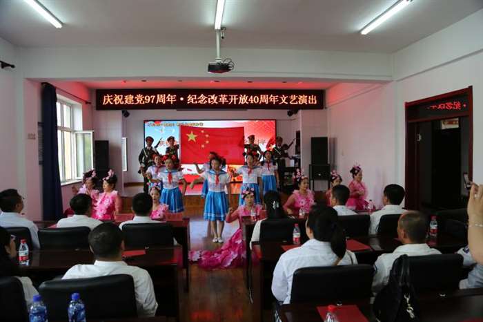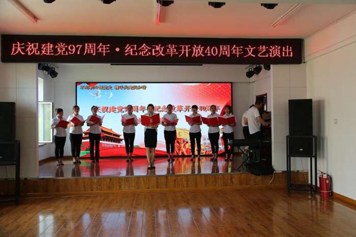 演出前,全场所有党员在党旗前举起右手庄严肃立,重温了入党誓词。此次演出节目丰富、体裁广泛,有独唱《最美的歌儿唱给妈妈》、《不忘初心》、群口快板《开启新时代,扬帆新征程》、诗朗诵《红船,从南湖起航》、手语舞蹈《国家》等歌颂党和国家的红色节目,丰富了群众的精神文化生活,现场气氛十分热烈。
