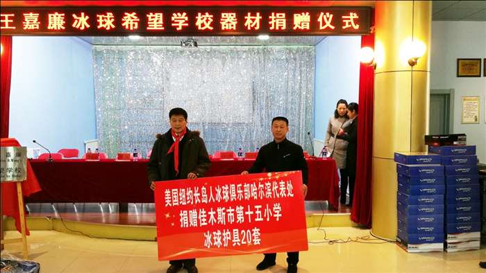 4月11日下午,第十五小学举行了“王嘉廉冰球希望学校”器材捐赠仪式。美国纽约长岛人俱乐部中国哈尔滨代表处首席代表王金玉、佳木斯教育局副局长于庆澎、佳木斯体育局副局长刘学东、郊区政府副区长白洁及郊区教育体育局相关负责人参加仪式。