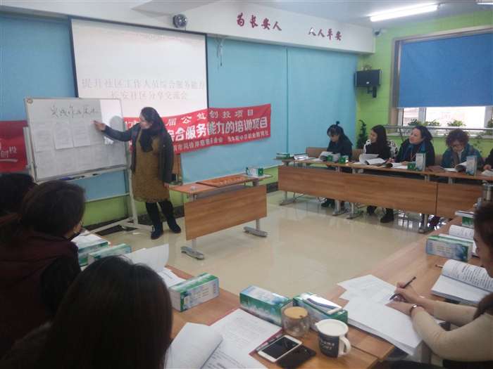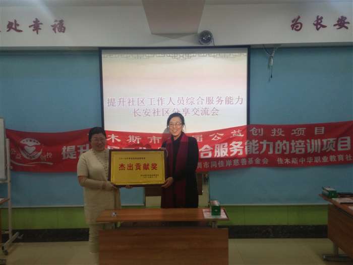 今年7月,经过长安社区和佳木斯中华职教社多次沟通交流开发的“提升社区工作人员综合服务能力”公益创投项目在我市首届公益项目创投大赛中中标,7月28日正式进入长安社区,12月15日下午,在项目总结分享交流会上的一片热烈掌声中,该项目圆满收官。 历时近6个月的培训过程中,佳木斯中华职教社汇集我市职业教育、公文撰写、心理学等方面的专家学者,为长安社区全体工作人员进行了10场职业提升课程培训,从人生和职业规划、心理疏导、沟通能力、公文撰写、应对突发事件共5个方面对社区工作人员进行了专业培训和实践操作指导,令大家受益匪浅。 佳木斯中华职教社秘书长皮秀云对全体工作人员给与充分肯定,代表佳木斯中华职教社授予了长安社区“2017年黄炎培职业教育杰出贡献奖”,并将该项目运行的全部过程和教案整理成《学习资料汇编》,赠与每名社区工作人员。在社区指导办和长安社区的全力邀请下,佳木斯市中华职教社将携全体专家教授团队于2018年1月3日至10日分两批对郊区17个社区的300余名工作人员进行“提升综合服务能力”集中培训。