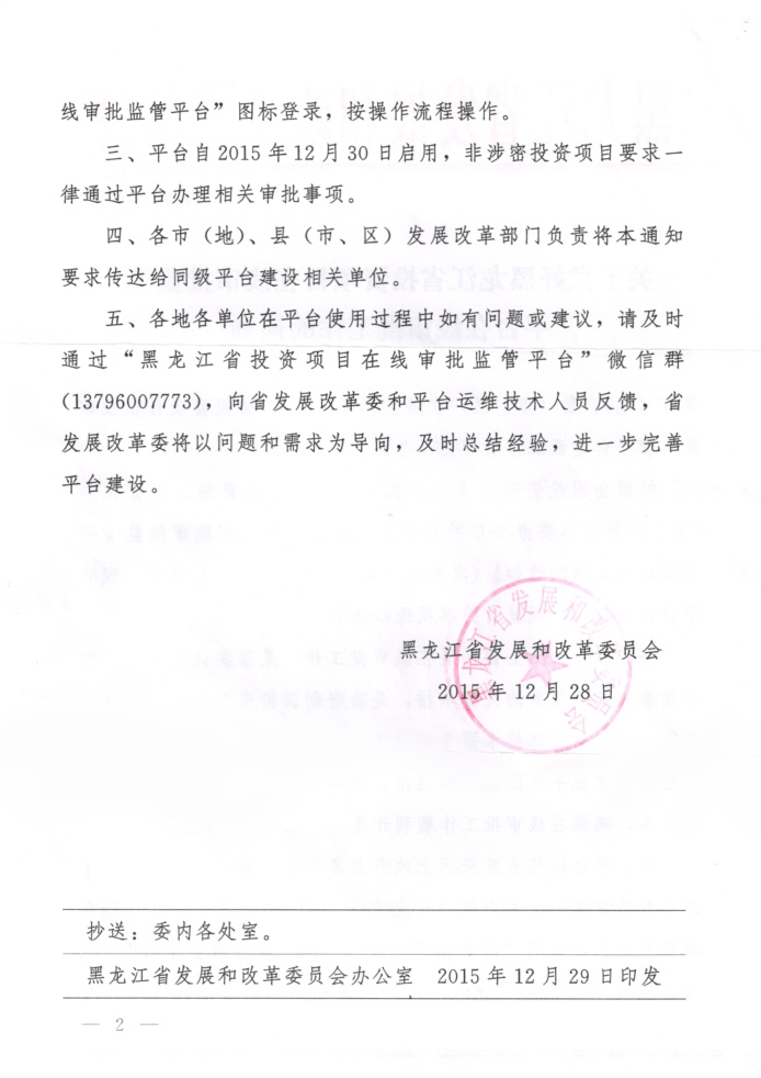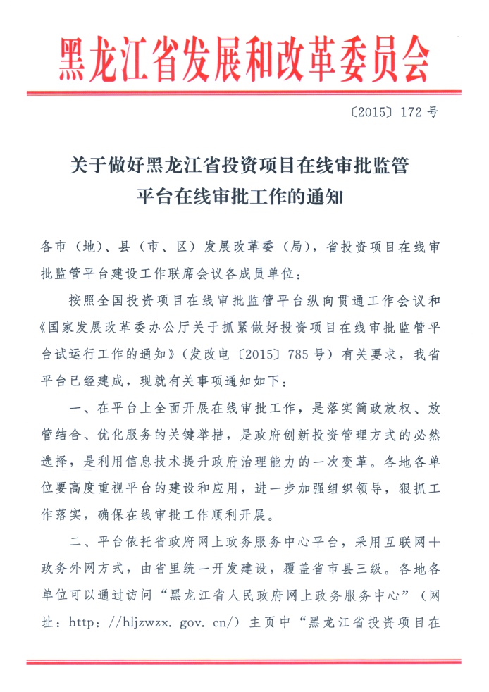 关于做好黑龙江省投资项目在线审批监管平台在线审批工作的通知