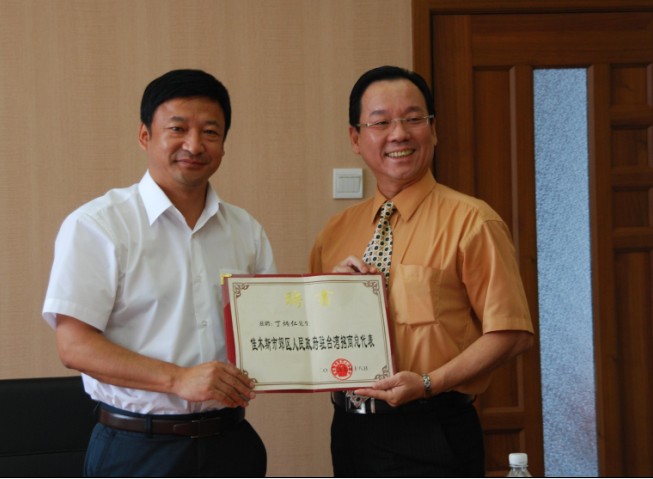 7月18日上午,郊区举行聘请高级商务顾问专题会议,区委书记邱士林同志为台湾商人丁炳仁发放了聘用证书。在聘请高级商务顾问专题会议上,邱书记指出,诚聘台商丁炳仁先生做郊区政府驻台湾招商总代表,这是经区商务部门精选推荐,区委、区政府审慎研究选定的,是郊区对丁炳仁先生人品、智慧、实力的认可。希望双方能保持经常性的沟通和联系,通过我们的交流与合作,为两岸的繁荣与发展做出积极贡献,郊区真诚地欢迎台湾同胞到郊区观光考察、投资兴业。 丁炳仁先生表示,一定积极向广大台商宣传郊区优惠的招商引资政策和良好的投资环境,力促台商早日在郊区兴办实业,为扩大两岸合作、增进同胞友谊贡献力量。会议由区商务局局长孙代君同志主持,区政协主席闫立海同志、区委副书记陈少华同志、区委常委、常务副区长梁庆民同志、区纪检委书记聂影同志、区政法委书记罗佳贤同志、区政府党组成员、发改局局长杨志国同志、区委办主任齐达同志、区政府办主任徐庆生同志参加了会议。