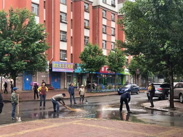 在大家的共同努力下,集中将辖区积水清理完毕,大家在清理积水过程中深受居民一致好评。在清水过程中,商户、企业也自发的加入到清队伍中,各自把自己门前的人行道的积水清理干净。