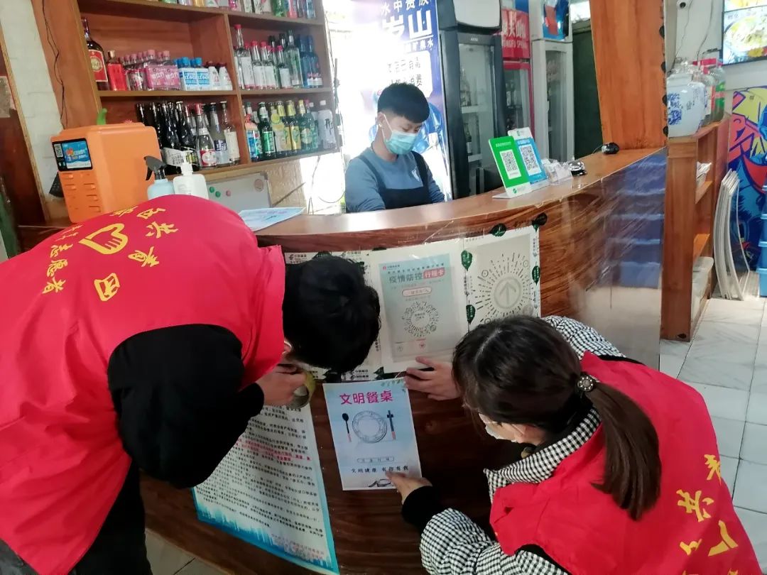 活动中,志愿者们来到辖区内的餐饮店铺,深入集市、居民区向餐饮店主和村民群众发放“文明餐桌·光盘行动”活动宣传画。希望餐饮店能够向顾客提倡“倡导节约、文明饮酒、餐后打包”的行为,鼓励顾客吃多少、点多少、不铺张浪费。