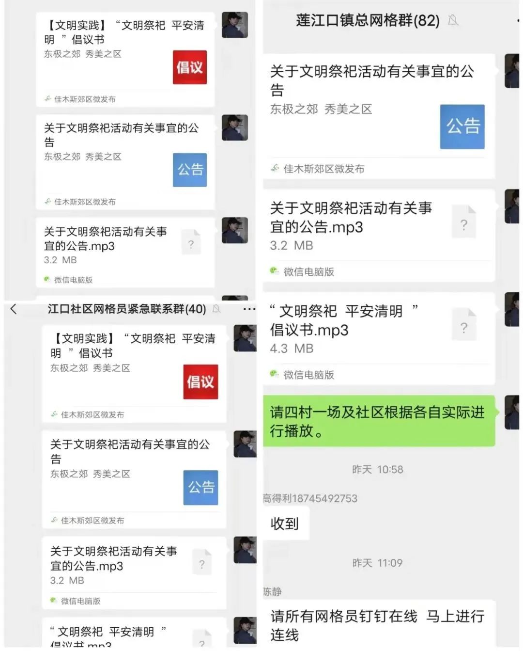 组织网格员通过网格群、微信群、张贴海报的形式对《佳木斯市文明祭祀条例》进行宣传,利用各村大喇叭将“文明祭祀 平安清明”倡议书和疫情防控音频进行轮流播放,共转发40余次,张贴倡议海报100余张。