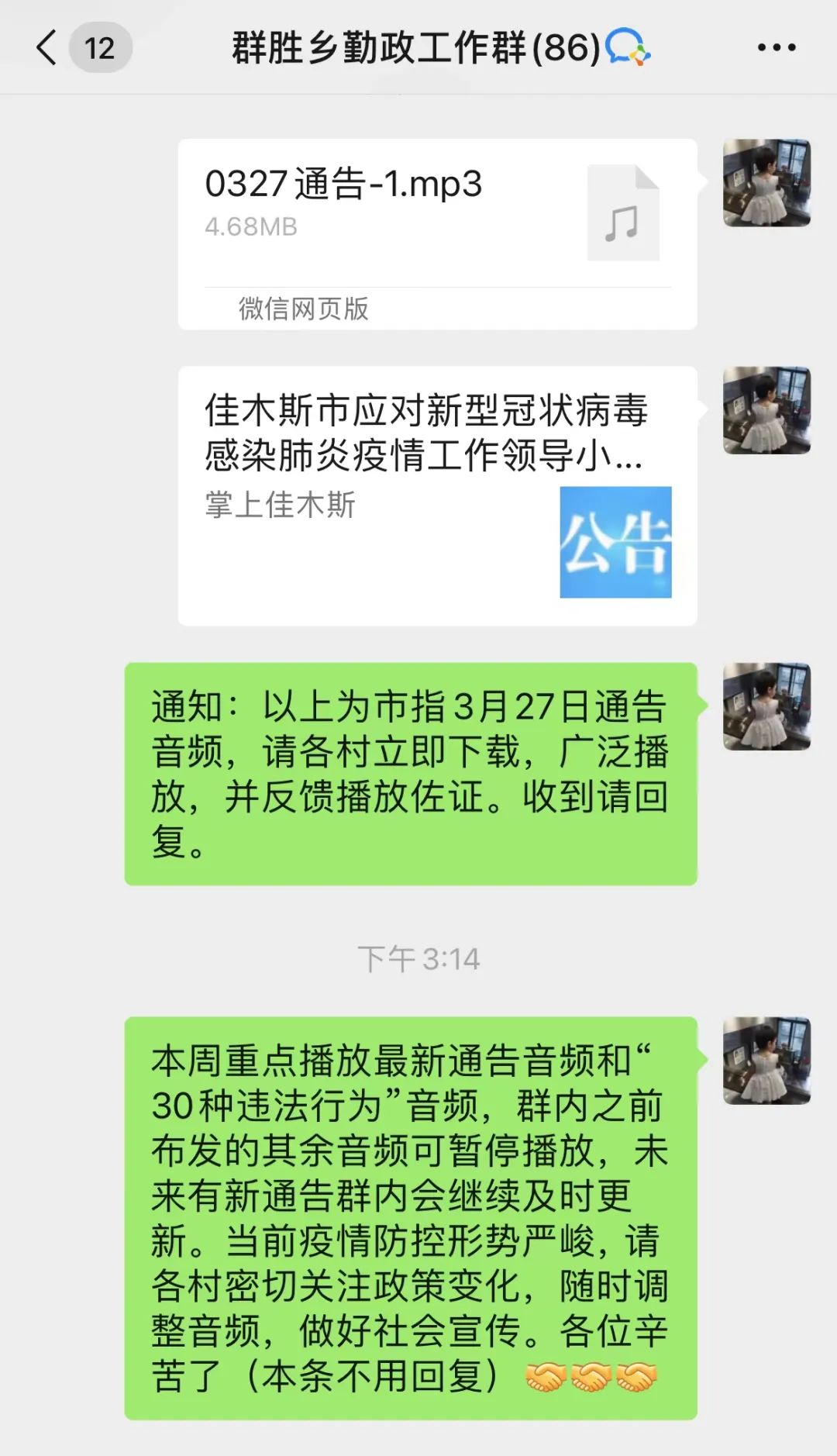3月27日,群胜乡第一时间通过线上召开疫情防控工作部署会议,传达贯彻《佳木斯市农村地区应对新冠疫情防控措施》有关工作要求,就做好当前疫情防控工作进行安排部署。会议号召全体党员干部要发挥模范带头作用,严格落实乡村两级责任制,坚持做到党政主要负责人亲自部署、班子成员具体落实,其他干部做好各自工作。持续强化全员核酸检测、消毒消杀等后勤物资保障工作,压实防控责任,落实防疫举措。
