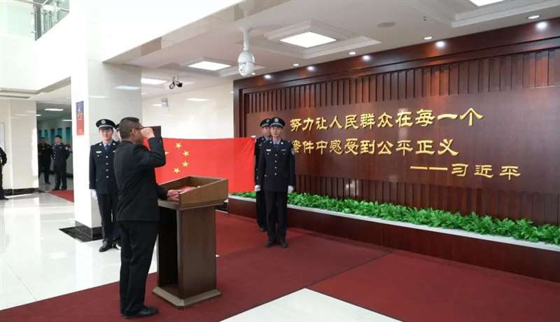 宣誓活动在庄严的国歌声中开始,全体员额法官、新入职干警在国旗下齐唱中华人民共和国国歌。领誓人手抚宪法,领诵誓词;全体宣誓人列队站立,高举右拳,向宪法庄严宣誓,“我宣誓:忠于中华人民共和国宪法,维护宪法权威,履行法定职责,忠于祖国、忠于人民,恪尽职守、廉洁奉公,接受人民监督,为建设富强民主文明和谐美丽的社会主义现代化强国努力奋斗!”75字誓词,字字铿锵,传递着法院人忠于宪法、维护宪法的坚定立场,表达了忠诚履行身上肩负的神圣职责的坚强决心。