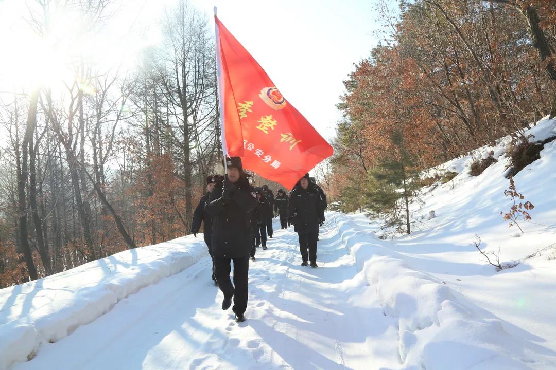 随后,在旗手引领下,参训同志身背95式突击步枪,在蜿蜒陡峭、布满积雪的山中完成3.5公里寒地武装徒步拉练。整个拉练过程,参训人员斗志昂扬、步伐铿锵,展现了郊区公安队伍积极的参训态度和饱满的精神状态。