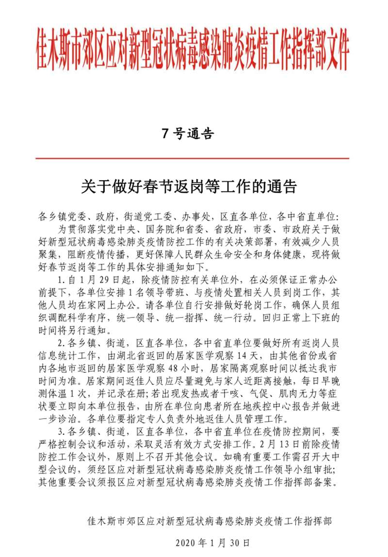 佳木斯市郊区应对新型冠状病毒感染肺炎疫情工作指挥部文件7号通告