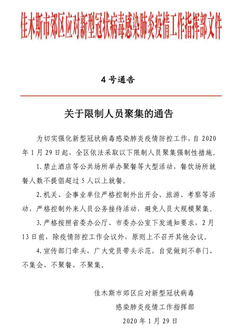 佳木斯市郊区应对新型冠状病毒感染肺炎疫情工作指挥部文件4号通告