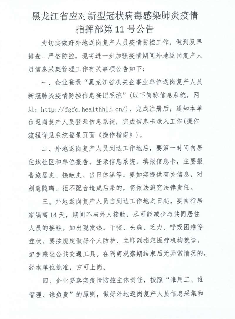 黑龙江省应对新型冠状病毒感染肺炎疫情指挥部第11号公告