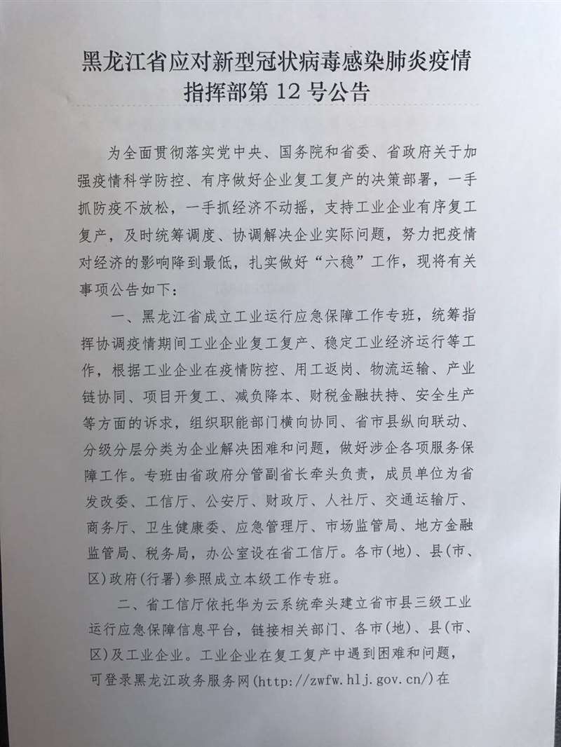 黑龙江省应对新型冠状病毒感染肺炎疫情指挥部第12号公告