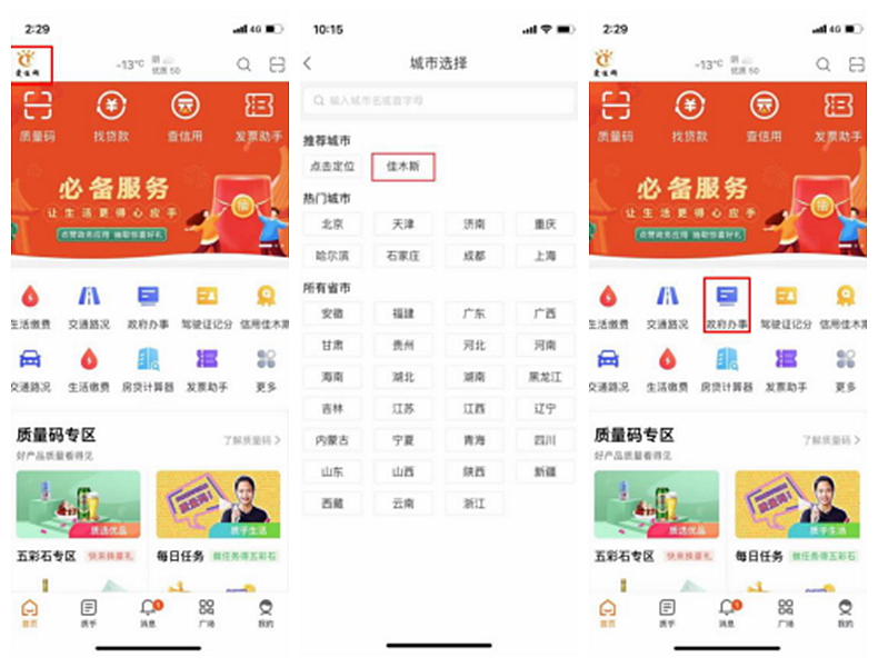 通过使用手机下载手机app“爱城市网”客户端,选择“佳木斯市”进行登录办理业务。