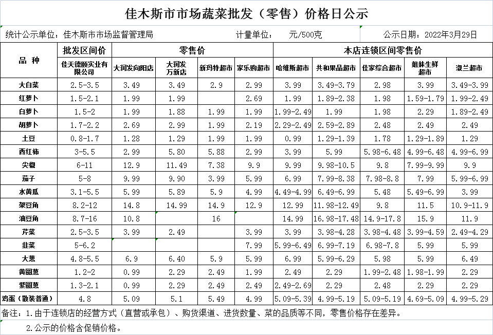 为切实维护疫情防控期间市场价格秩序,使我市重要民生商品市场价格更加公开、透明,同时为广大消费者提供购物参考,佳木斯市市场监督管理局选取市区内部分批发市场和零售商超,对当日批发(零售)的蔬菜价格面向社会公示。现将3月29日部分主要蔬菜价格公示如下: