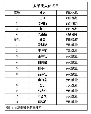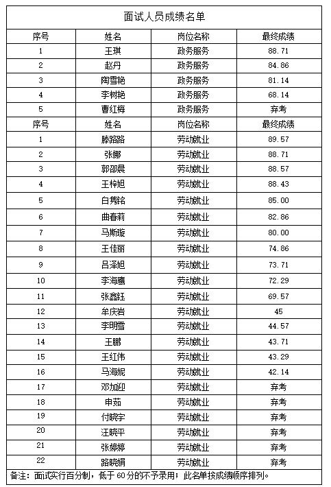 根据《佳木斯市郊区创业就业服务中心公开招聘公益性岗位人员公告》规定,现将面试成绩予以公布(面试实行百分制,低于60分的不予录用)公示期3个工作日(2022年8月10日--8月12日)。如考生对本人成绩有异议,可在公示期内反映,逾期不予受理。反映情况和问题必须实事求是,对线索不清的匿名电话,不予受理。面试录取人员在2022年8月15日--8月19日进行政治审查和体检等相关入职手续。如有变动,将电话另行通知。