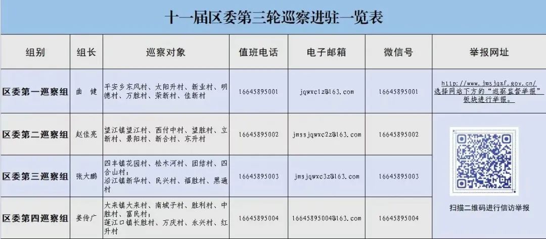 按照区委统一部署,十一届区委第三轮巡察正式启动。经区委批准,区委第一至第四巡察组已于2023年5月5日开始,采取分期进驻的方式,对平安乡东风村、太阳升村、新业村、明德村、万胜村、荣新村、佳新村;望江镇望江村、西付中村、望胜村、立新村、景阳村、新合村、东升村;四丰镇花园村、松木河村、团结村、四合山村;沿江镇新华村、民兴村、福胜村、黑通村;大来镇大来村、南城子村、胜利村、中胜村、富民村;莲江口镇长胜村、万庆村、永兴村、红升村,31个村级党组开展常规巡察;巡察期间,设专门值班电话、邮箱、微信、网址。根据巡视工作条例规定,巡察组主要受理反映被巡察村“两委”班子及其成员和其他党员问题的来信来电来访和微信举报。受理范围重点是关于上述村“两委”班子及其成员和其他党员违反政治纪律、组织纪律、廉洁纪律、群众纪律、工作纪律、生活纪律等方面的举报和反映。受理信访时间、地点以各被巡察村巡察公告为准。