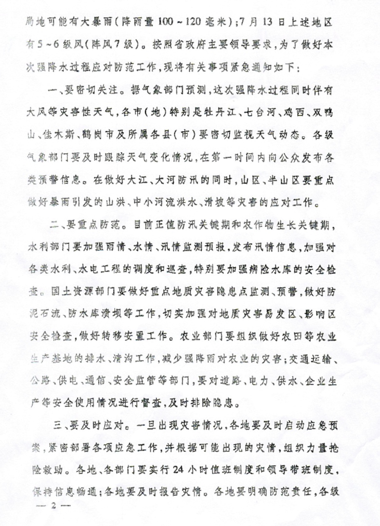 黑龙江省人民政府办公厅关于做好强降水防范应对工作的紧急通知