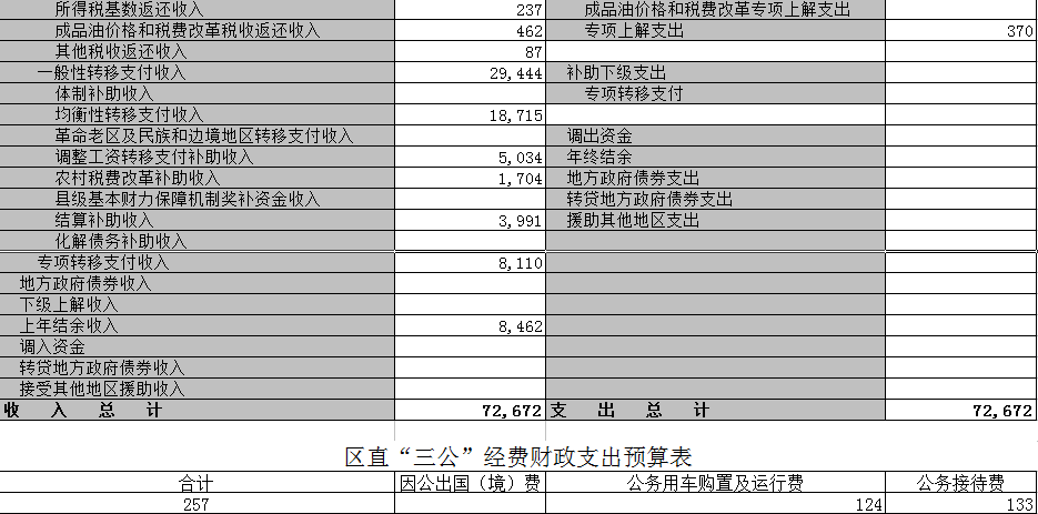 一、2014年预算编制说明 2014年预算安排的指导思想是:以十八届三中全会精神为统领,以财政体制改革为动力,全面落实区委九届三次全会精神,继续强化税收征管,应收尽收;继续优化支出结构,着力改善民生;继续拓宽融资渠道,盘活资产;继续强化监督,加大投入,促进经济持续健康发展、社会和谐进步。 (一)收支安排基本情况 全区公共财政总收入72672万元。其中,公共财政收入23650万元,增收2812万元,增长13.5%,占总收入的32.5%;上级补助收入40560万元,占总收入的55.8%;上年结余收入8462万元,占总收入的11.6%。全区公共财政总支出72672万元。其中,公共财政支出72302万元,比上年预算数减支9981万元,减少12.1%;专项上解支出370万元。 (二)公共财政预算支出重点民生资金安排 (1)教育支出20360万元,占公共财政预算支出的28.02%。 (2)文化体育与传媒支出352万元,占公共财政预算支出的0.48%。 (3)社会保障和就业支出7682万元,占公共财政预算支出的10.57%。 (4)医疗卫生支出5402万元,占公共财政预算支出的7.43%。 (5)节能环保支出1274万元,占公共财政预算支出的1.75%。 (6)城乡社区事务支出3924万元,占公共财政预算支出的5.39%。 (7)农林水事务支出9945万元,占公共财政预算支出的13.68%。 (8)住房保障支出3580万元,占公共财政预算支出的4.93%。 二、“三公”经费预算汇总情况说明 经汇总,2014年我区区直安排的“三公”经费预算257万元。其中,公务用车运行费预算124万元,公务接待费预算133万元。 附表:公共财政收支预算表及区直“三公”经费支出预算汇总表
