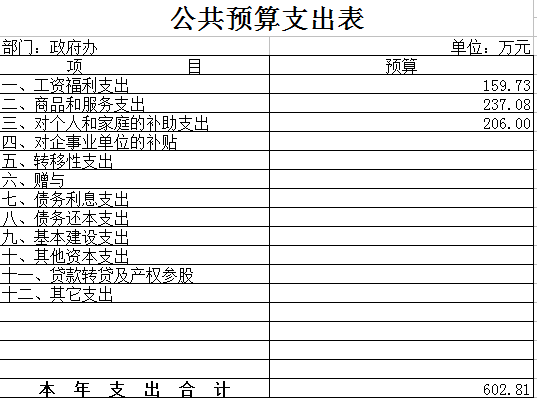 一、政府办主要职能 (一)负责承担区政府大型综合材料和领导讲话的起草、审核、修改工作等。 (二)负责区政府党组会议、常务会议、区长办公会议、全体成员会议、区政府重大会议的会务工作和区政府重大活动组织安排。 (三)督促检查区政府重要工作部署,会议决定事项、领导重要批示的执行情况。 (四)负责人大代表建议、政协委员提案办理及办理情况的反馈工作。 (五)协助区政府领导审核或组织起草义区政府、区政府办公室名义发布的各类文件等。 (六)负责区政府总值班安排和公务接洽,特别是做好突发事件和重大事故情况的反映和综合协调。 (七)负责区政府办公室财务工作。 (八)负责区四个班子领导的接待服务工作,后勤工作和离退休人员管理、服务工作:负责区政府办公楼及二办的管理和安全保卫工作。 (九)负责办公室及直属单位的人事劳资、干部教育 职称评聘、纪律检查等。 (十)认真贯彻执行国家、省、市的侨务工作的方针、政策和有关规定,开展好各项侨务工作。 (十一)贯彻执行国家有关民族、宗教政策和法律、法规,并开展好管理教育工作,检查民族、宗教政策和法律、法规的执行情况。 (十二)负责全区规范性文件的审核、制定及监督贯彻执行情况。 (十三)承办区政府交办的其它事项。 二、 2014年政府办部门预算总体情况 预算总收入602.81万元,其中:财政拨款收入602.81万元。预算总支出602.81万元,其中:一般公共服务支出413.81万元,社会保障和就业支出189万元。(工资福利支出159.73万元,商品和服务支出237.08万元,对个人和家庭补助支出206万元)。 附表: 1、《公共预算收支总表》 2、《公共预算支出表》 3、《三公经费财政拨款支表》
