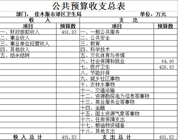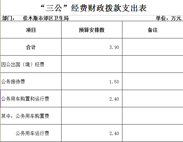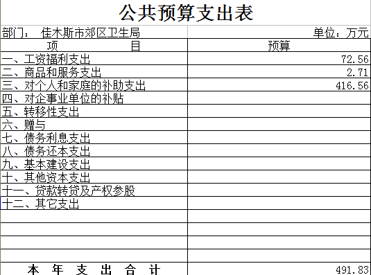 一、郊区卫生局主要职能 (一)贯彻执行国家和省市卫生工作的方针,政策,法规以及各种卫生技术标准,规章。 (二)研究制定全区卫生事业发展规划,制定疾病防治规划,并负责组织协调和实施工作。 (三)在区政府的领导下,制定全区卫生工作的有关规章制度。 (四)依据卫生法规,标准,对社会公共卫生,医疗,防疫,妇幼保健,医用生物材料及制品,医疗器械行使监督管理职权,对重大疾病及医疗质量等实行监测。 (五)贯彻落实卫生技术人员职业道德规范的实施细则;进行卫生专业技术培训和法制教育,促进卫生行业的社会主义精神文明建设。 (六)建立和完善卫生统计,信息系统,做好卫生统计与信息的管理工作。 (七)遇有重大突发事件和自然灾害时,负责组织全区卫生技术力量,协助有关部门抢救伤员,防止和控制疾病的传染,蔓延。 (八)负责全区爱国卫生的具体工作。 (九)承办区政府交办的其他事项。 二、 2014年郊区卫生局部门预算总体情况 2014年,郊区卫生局部门预算总收入491.83万元,其中:财政拨款收入491.83万元。预算总支出491.83万元,其中:工资福利支出72.56万元,商品和服务支出2.71万元,对个人和家庭补助支出70.86万元,政策性支出345.7万元。 附表: 1、《公共预算收支总表》 2、《公共预算支出表》 3、《三公经费财政拨款支表》