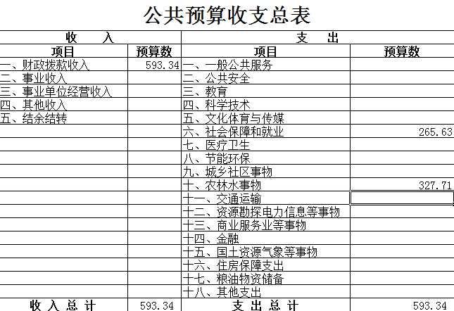 2014年,部门预算总收入593.34万元,其中:财政拨款收入593.34万元。预算总支出 593.34万元,其中:社会保障和就业支出265.63万元,农林水支出327.71万元。工资福利支出317.45万元,商品和服务支出9.89万元,对个人和家庭补助支出266万元。