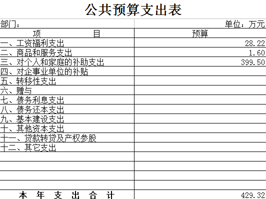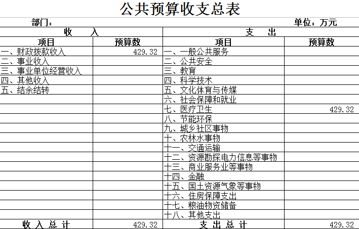 预算总收入429.32万元,其中:财政拨款收入429.32万元。预算总支出429.32万元,其中:医疗卫生支出429.32万元。(工资福利支出28.22万元,商品和服务支出1.6万元,对个人和家庭补助支出399.5万元)。